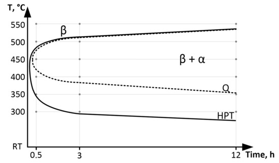 Thus, the results of XRD study revealed the following pattern of phase transformations during annealing of Q-alloy. The isothermal ωiso phase in Q-alloy during annealing at 300 and 350 °C is formed, as was observed for other Ti β-alloys [35]. As the annealing temperature increases, the α-phase is formed. A 0.5 h annealing at the lowest (threshold) temperatures for ω- and α-phase formation (300 °C for ω-phase and 400 °C for α-phase) does not lead to their active release and they are not registered by XRD. An increase in annealing temperatures of 50 °C (350 °C for ω-phase and 450 °C for α-phase) at 0.5 h leads to their formation in a quantity of more than 20%. The maximum amount of α-phase in Q-state–of about 40% is reached after annealing at 400 °C 12 h. During annealing at 550 °C for 12 h, α-phase practically is not formed. The obtained results correlate with common knowledge [25] that the α-phase formation in Ti-18Zr-15Nb alloy occurs by C-shaped kinetics with a pronounced peak near 400–450 °C and stops or slows down at higher and lower annealing temperatures (Figure 8).