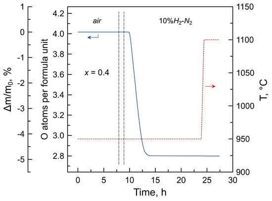 Thermogravimetric analysis (TGA, Setaram SetSys 16/18 instrument, Setaram, Caluire, France, sensitivity 0.4 μg, initial sample weight 0.5–1.0 g) was carried out in flowing air on heating/cooling at 25–1000 °C with a constant rate of 2 °C/min or with isothermal equilibration steps (3 h) at 700–950 °C. After thermal cycling in air, each sample was reduced isothermally at 950 °C in flowing 10% H2-N2 flow (Figure 1) in order to determine the absolute oxygen content. The reduction step was 15 h long to ensure the complete transformation into a mixture of metallic nickel with lanthanum and barium oxides (Figure S2). All thermogravimetric data were corrected for buoyancy effects by subtracting the corresponding baselines recorded under identical conditions using a dense inert ceramic sample of a similar volume. Dilatometric studies were performed employing a vertical Linseis L75 dilatometer in flowing air in the temperature range between room temperature and 1000–1100 °C with a constant heating/cooling rate of 3 °C/min.