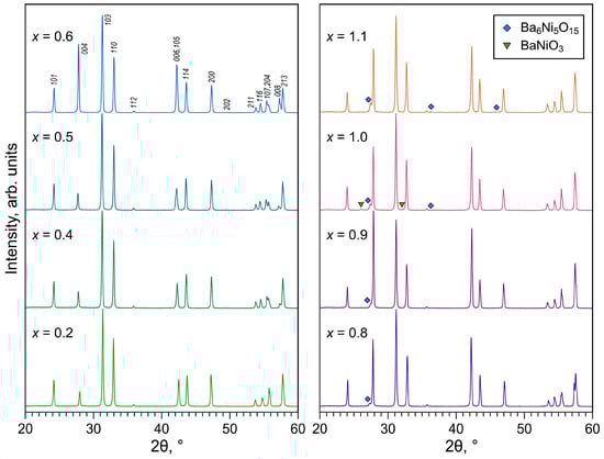 X-ray diffraction of sintered La2−xBaxNiO4±δ ceramic samples showed the formation of solid solutions with Ruddlesden–Popper K2NiF4-type structures for the entire range of prepared compositions (Figure 2). The compositions with moderate barium contents, x ≤ 0.6, were virtually phase-pure. XRD patterns of the Ba-rich (x ≥ 0.8) samples exhibited additional reflections assigned to the secondary phases of the BaO-NiO system; the amount of impurity phases increased with increasing nominal barium content (Figure 2). Preferred orientation effects indicated by the elevated intensity of (00l) reflections can also be observed in the XRD patterns of the x = 0.6–1.1 samples, which is rather common for Ruddlesden–Popper layered structures due to the anisotropy of ceramic fracture during milling.