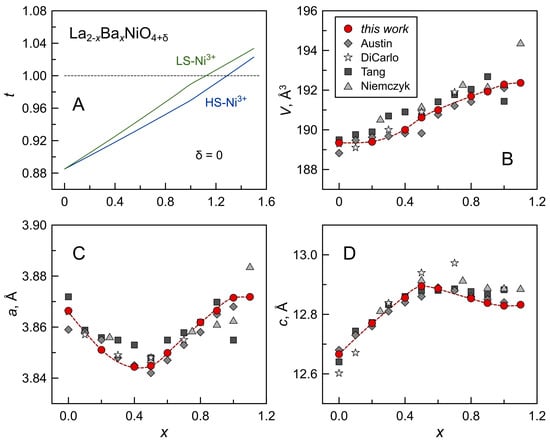 The coordination number of oxygen anions is debatable but often assumed to be VI in perovskite-like structures. Empirically, the tetragonal RP-type A2BO4 structure is stable over the approximate range of 0.85 < t < 1.00 []. If the tolerance factor exceeds 1, the A cation is too large (or the B cation is too small) for a tetragonal structure, and the formation of a hexagonal structure is favorable. Figure 4A shows the variation of the tolerance factor for the La2−xBaxNiO4±δ series estimated neglecting oxygen nonstoichiometry and assuming that oxygen ions are in O2− (CN = 6) state and that acceptor-type substitution by Ba2+ is charge-compensated by Ni cations in 3+/4+ oxidation states. The simple estimations show that the tetragonal lattice of La2−xBaxNiO4±δ can be expected to form up to x = 1.0–1.1 (Figure 4A). Tang et al. [] argued, however, that a larger thermal expansion of more ionic (La,Ba)-O bonds compared to Ni-O bonds on heating should result in an increasing mismatch in the bond lengths, thus further narrowing the range of barium solid solubility at elevated temperatures.