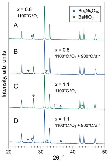 XRD patterns of La2−xBaxNiO4±δ ceramics (x = 0.8 and 1.1) sintered at 1100 °C for 5 h in oxygen (A,C) and subsequently annealed at 900 °C for 2 h in air (B,D). The reflections of secondary phases are marked according to ICDD PDF 04-007-8462 (hexagonal BaNiO3) and 04-009-3992 (rhombohedral Ba6Ni5O15).