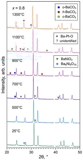 Barium and nickel oxides may exist as individual precipitates, convert to carbonates/hydroxides (in the case of barium), or combine to form low-melting phases of the Ba-Ni-O system [,,], such as hexagonal BaNiO3 [] or rhombohedral Ba6Ni5O15 (BaNi0.83O2.5) [].