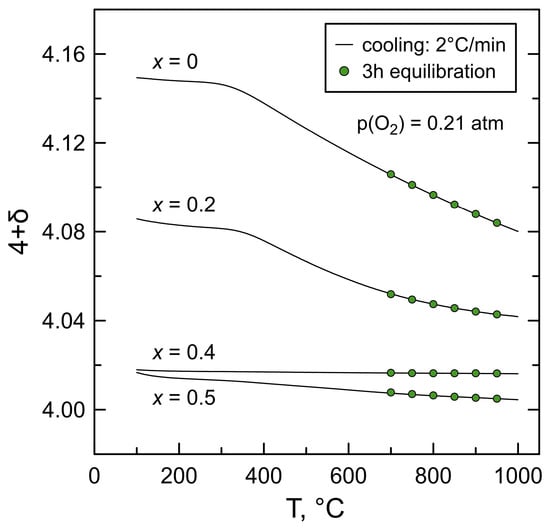 The results of thermogravimetric studies indicate that La2−xBaxNiO4+δ nickelates with moderate barium contents, x ≤ 0.5, remain oxygen-overstoichiometric at atmospheric oxygen pressure and temperatures ≤ 1000 °C (Figure 8).