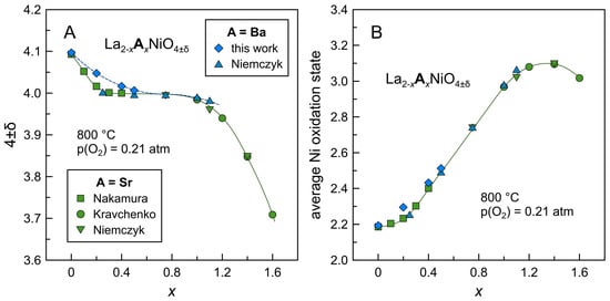 Dependence of oxygen nonstoichiometry (A) and average nickel oxidation state (B) in Ln2−xAxNiO4±δ nickelates on barium and strontium content at 800 °C. Literature data are taken from Nakamura [], Kravchenko [], and Niemczyk [].
