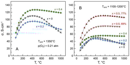 Temperature dependence of electrical conductivity of La2−xBaxNiO4+δ ceramics sintered at 1350 °C (A) and 1100–1200 °C (B). The fabrication conditions and relative density of all samples are detailed in Table 1.