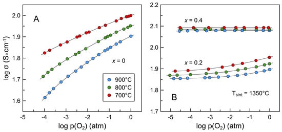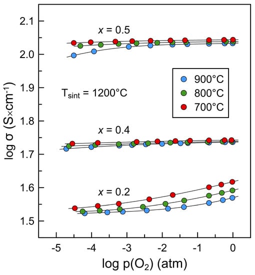 Figure 11 and Figure 12 present isothermal dependencies of electrical conductivity of La2−xBaxNiO4+δ ceramics on oxygen partial pressure at 700–900 °C and p(O2) range from 10−5 to 1.0 atm. Reducing p(O2) results in a decrease in p-type electronic conductivity. Once again, this happens due to reversible oxygen release from the oxide lattice and the accompanying reduction in the electron-hole concentration: