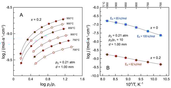 (A) Dependence of oxygen permeation fluxes through La1.8Ba0.2NiO4+δ ceramic membrane on oxygen partial pressure gradient at 700–950 °C; (B) Temperature dependence of oxygen permeation fluxes through La2−xBaxNiO4+δ ceramic membranes under fixed p(O2) gradient. d is membrane thickness; p2 and p1 are oxygen partial pressures at the membrane feed and permeate side, respectively. The membranes were sintered at 1350 °C.