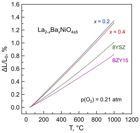 Dimensional changes of La2−xBaxNiO4+δ (x = 0–0.5) ceramics on thermal cycling in air between room temperature and 1000 °C were studied by dilatometry. Selected dilatometric curves in comparison with the data on 8YSZ and BZY15 solid electrolytes are shown in Figure 14. La2−xBaxNiO4+δ ceramics exhibit smooth, nearly linear thermal expansion in air. The average thermal expansion coefficients (TECs) in the studied temperature range vary in a narrow range, 13.8–14.3 ppm/K (Table 2), and tend to decrease slightly with increasing barium content. The latter can be attributed to decreasing chemical contribution to thermochemical expansion. Chemical expansion originates from the variations in oxygen nonstoichiometry δ and, consequently, the average ionic size of nickel cations in the crystal lattice on thermal cycling [] and should vanish with increasing barium content, as follows from the data on oxygen nonstoichiometry (Figure 8).