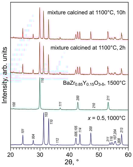 Good compatibility with no evidence of segregation of reactivity products was found for La2−xBaxNiO4±δ + BZY15 pairs under identical annealing conditions. The traces of barium carbonate observed in the XRD patterns originate from commercial BZY15 powder (used in the as-delivered state) and can be eliminated by calcination at ≥1300 °C. Thus, BZY15 ceramics with reported oxygen-ion transference numbers of 0.7–0.9 in the temperature range of 500–600 °C in wet O2 [] seems a reasonable alternative as a solid electrolyte for electrocatalytic tests of La2−xBaxNiO4±δ nickelates. In order to evaluate the compatibility of nickelates with barium zirconate-based ceramics at higher temperatures corresponding to anticipated electrode fabrication conditions, the mixture of La1.5Ba0.5NiO4+δ and BZY15 powders was annealed at 1100 °C for 2 and 10 h and then examined by XRD. For these tests, BZY15 compacts were sintered at 1500 °C and then crushed into powder, while La1.5Ba0.5NiO4+δ powder was used in the as-synthesized form (i.e., after calcinations at 1000 °C in air). No evidence of reactivity or formation of secondary phases could be observed in the XRD patterns of calcined mixtures (Figure 15) confirming good chemical compatibility between the materials at temperatures at least up to 1100 °C.