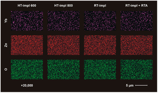EDS mapping of Yb (pink), Zn (red), and O (green) for ZnO implanted with 150 keV Yb ions to the fluence of 1 × 1015/cm2 was performed for samples implanted at different temperatures: 600 °C (HT-impl 600), 800 °C. (HT-impl 800), and RT (RT-impl) as well as implanted at RT and subsequently RTA-annealed for 10 min at 800 °C in an oxygen atmosphere (RT-impl +RTA).