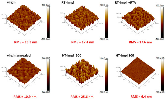 AFM imaging of the surface morphology for ZnO before (virgin) and after implantation at different temperatures with 150 keV Yb ions to the fluence of 1 × 1015/cm2 as well as RT-implanted samples and subsequently RTA-annealed for 10 min at 800 °C in O2.