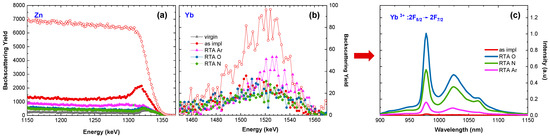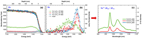 Finally, the optical response of Yb ions implanted at the optimum temperature (600 °C) is compared with the optical response of these ions implanted at RT and subsequently annealed at 800 °C in oxygen (Figure 8c). Although, as can be observed in the aligned RBS spectra (and Table 3), the crystal structure recovery is only slightly better for RT implantation and subsequent annealing (Figure 8a), the recorded luminescence efficiency for this sample is four times higher (Figure 8c), showing that this way of preparing samples is the most beneficial for the optical applications of ZnO:RE systems. This effect might be assigned to both better crystal structure recovery and a lower number of Yb ions on the crystal’s surface as can be deduced from Figure 8b. However, the role of oxygen in the luminescence of ZnO seems to be important. It may be assumed that oxygen diffuses into the sample during RTA and oxidizes RE to the 3+ state which increases PL [39], but the other scenarios are also possible [64].