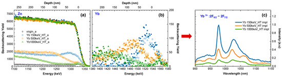 Other interesting conclusions have been drawn from the experiment, in which different energies of implanted ions are used, resulting in a different implantation depth. In the experiment, epitaxial ZnO films were implanted at 600 °C with Yb ions at energies of 150, 500, and 1000 keV, which results in ~100, 160, and 240 nm modified layers, respectively. The RBS-aligned spectra (Figure 4a,b), confirmed by simulations performed using the McChasy code [59,60], show that the number of point defects increases with the implantation energy, but the density of extended defects, such as dislocations, is smaller for the faster ions. Regardless of these subtle differences in the defects’ structure, the luminescence efficiency, presented in Figure 4c, is significantly lower for deeper implantations, probably due to the high-light absorption coefficient, which for ZnO is about 5 × 104/cm [61].