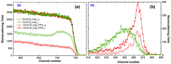 The crystalline structure recovery effect of ZnO:RE implanted at RT is also observed after PPA, as shown in Figure 5a, where the RBS spectra of ZnO implanted at RT with Dy ions and subsequently PPA annealed are presented. The above studies are conducted on the ZnO:Dy system; however, as previously reported, there is no difference in the level of structural damage after implantation with different RE ions at the same fluence [17]. Unfortunately, after this kind of annealing, the RE atoms diffuse to the sample surface (Figure 5b), and no light coming from RE3+ is observed, as in the high-temperature cases (see Figure 3c). This means that neither FLA nor PPA are useful for the optical activation of RE in ZnO:RE systems.