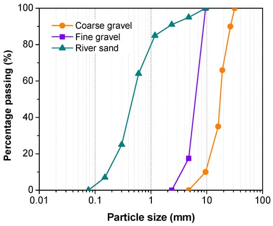 Commercial MPC was supplied by Guizhou Linmei Materials Co., Ltd., Guiyang, China. The main components of this cement were dead-burned MgO, ammonium dihydrogen phosphate (NH4H2PO4), and borax decahydrate (Na2B4O7·10H2O). F-class fly ash (FA) obtained from a local coal-fired thermal power station, with a surface area of 3850 cm2/g and a density of 2.80 g/cm3, was incorporated into the binder. The chemical compositions of MPC and FA are shown in Table 1. The aggregates used in this study were natural sand with a specific gravity of 2.58 and fine/coarse gravel with a specific gravity of 2.61. The maximum particle size of natural sand, fine gravel, and coarse gravel were 4.75, 9.5, and 26.5 mm, respectively. The cumulative sieve residue curves of natural sand and gravel are shown in Figure 1.