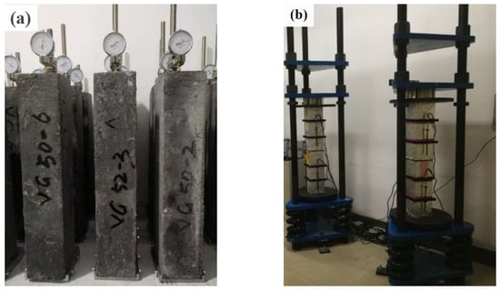 Three identical prismatic specimens with dimensions of 100 mm × 100 mm × 515 mm were prepared for each mix and used to measure unrestrained shrinkage following GB/T 50082-2009 []. These shrinkage specimens are also referred to as “unloaded” specimens or as MX-S series (where MX represents M1, M2, or M3). Prepared shrinkage specimens were vertically placed in the shrinkage test frame and a dial gauge was mounted on the top of each prism, as shown in Figure 2a. The first dial gauge readings were recorded 3 days after molding. Thereafter, specimen lengths were periodically measured for 550 days. The shrinkage test was performed in a laboratory room. The shrinkage strains over time were calculated by using Equation (3). The final shrinkage strain value of each mix reported was averaged from three specimens.