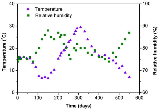 MPC concrete specimens were placed in a laboratory without constant temperature and relative humidity. The changes in temperature and relative humidity during the test period are shown in Figure 3. At the beginning of the test (before 75 days), the temperature was maintained at 15 ± 2 °C and the relative humidity of interior air was stabilized between 74–76%. Afterward, the temperature and relative humidity changed with the seasons. The maximum temperature was nearly 30 °C in summer and the minimum was approximately 6 °C in winter. The relative humidity of indoor air increased as the temperature dropped, and exceeded 80% when the temperature was lower than 10 °C. The deformation behaviors of MPC concrete could be affected by ambient temperature and relative humidity.