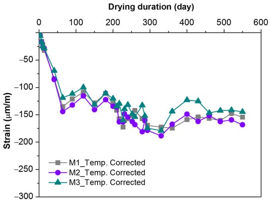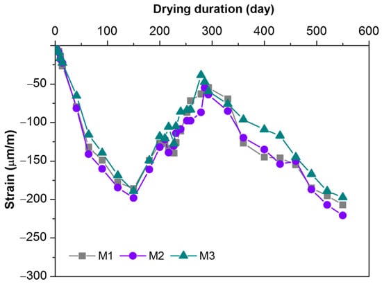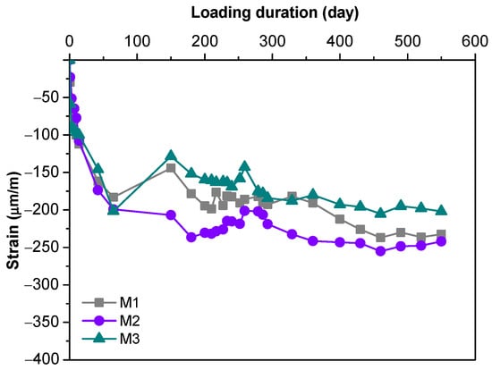 Figure 5 shows the temperature-corrected shrinkage strains of unloaded specimens. The shrinkage strains showed a continuous increase at the beginning of the test and reached −120 to −135 με after around 65 days. It was estimated that the shrinkage strain was mainly due to the decreased content of free water as a result of its participation in reaction in the early stage and migration or evaporation in the late stage []. After 65 days, the shrinkage strain continuously fluctuated (probably due to changes in relative humidity) and tended to be stable until the end of the test. The final temperature-corrected shrinkage of MPC concrete reached −140 to −170 με, which corresponded to one-third of that of Portland cement []. M2 had a slightly higher shrinkage strain than M1 or M2 due to its higher cement content. The w/b ratio of MPC concrete in this study was only 0.17, which was much lower than that of Portland cement concrete with the same strength grade [,]. Excess water in concrete exists in the form of free water. When free water is lost, capillary pressure increases and shrinkage occurs; therefore, the more free water there is, the greater the drying shrinkage is.