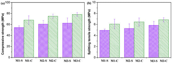 Mechanical properties of MPC concrete samples after 550 days of shrinkage and creep testing. (a) compressive strength; (b) splitting tensile strength.