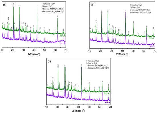 XRD patterns of MPC concrete samples after 550 days of shrinkage and creep tests. (a) M1, (b) M2, and (c) M3.