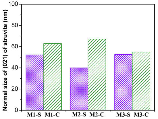 The XRD patterns of MPC samples after shrinkage and creep tests are shown in Figure 8. Comparison of these patterns shows that the crystalline phases of the samples were consistent after the creep and shrinkage tests, mainly including unreacted periclase (MgO), quartz (SiO2), struvite (NH4MgPO4·6H2O), and dittmarite (NH4MgPO4·H2O). Unreacted periclase, identified as MgO, was generally added in excess to ensure the complete reaction of all phosphates; it could act as micro-aggregates and thus restrain the deformation of hydration products. Struvite was founded to be the main crystalline product of MPC, which has cementitious properties and provides excellent mechanical properties for MPC concrete. The minor presence of dittmarite could be from the reaction between MgO and NH4H2PO4 or the dehydration of struvite at a peak hydration temperature higher than 70 °C []. These results indicate that the sustained loading did not change the type of hydration products. However, the sustained compressive stress could change the grain size of struvite. The crystal size of struvite [021] is calculated using Equation (6) as recommended by [], and the results are presented in Figure 9. The calculations are based on the assumption that the broadened width of the diffraction peak is only caused by the size of the crystal structure, which is uniform. It is shown that the crystal size of struvite was increased after 550 days of sustained loading. The increase in crystal size of struvite may change the internal stress distribution and improve the mechanical properties of MPC concrete.