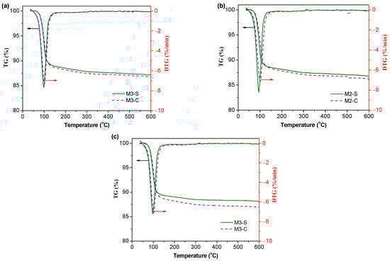 The TG curves and differential (DTG) curves of MPC samples after shrinkage and creep tests are shown in Figure 10. Only one weight loss event between 50 and 200 °C was observed in the curves, which was associated with the decomposition of struvite []. This result further confirms that creep strains do not affect the type of hydration products. When compared with shrinkage samples, creep samples revealed higher weight losses observed up to 200 °C. For example, the weight losses below 200 °C were 10.9% and 11.8% for M3-S and M3-C, respectively. This strongly suggests that sustained stress can promote the formation of struvite, which has a positive effect on mechanical strengths. A similar result was confirmed by Liu [], who highlighted that compression load would help cement-based material, especially at an early age, to promote hydration.