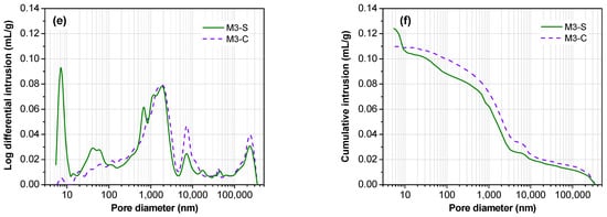 Pore size distribution of different MPC concrete samples. (a) log differential intrusions of M1, (b) cumulative pore volume of M1, (c) log differential intrusions of M2, (d) cumulative pore volume of M2, (e) log differential intrusions of M3, (f) cumulative pore volume of M3.