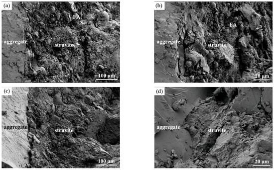 Typical microstructures of fracture surfaces of selected samples after creep and shrinkage tests are shown in Figure 12. Some particles with round shapes were observed in the samples due to the incorporation of FA. Abundant struvite crystals with less regular morphology were formed, constructing a dense microstructure. It is reported that a loose interface transition zone between aggregate and hardened MPC paste was observed at an early age due to wall effect []. However, it can be seen from Figure 12 that the interface between aggregate and hydrated cement paste was closely combined after shrinkage and creep tests. By comparing these figures, no obvious differences can be found in the microstructures of the fracture surface of shrinkage and creep samples.