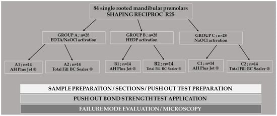 The primary outcome variable of the study is the push-out bond strength on root canals. The appropriate Type I error was set at 5.0% and the power was set at 95%. Using the data of a previous study [27], a sample size of 14 in each subgroup was used to detect a significant difference with an estimated effect size of 1.451.