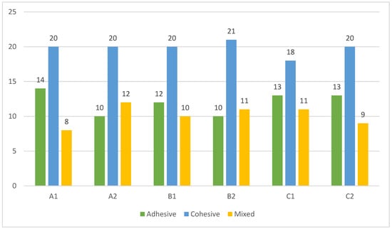 The frequency distribution of the specimens according to the modes of failure are illustrated in Figure 3; the most common failure mode was the cohesive (47.2%), followed by the adhesive (28.6%) and the mixed (24.2%) mode. There were no statistically significant associations between the mode of failure and the sub-groups (p > 0.05); no statistically significant relationship was found between the failure modes and the root levels (p > 0.05).
