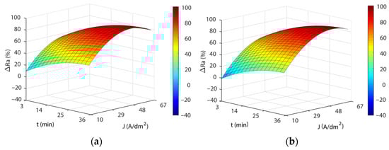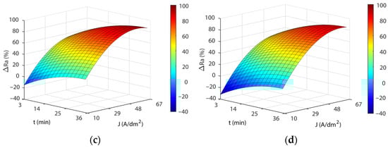 As shown in Figure 4, the response surface obtained in the model Equation (3) exhibited similar behavior to that obtained for initial texture , except for the temperature factor. Once again, a significant interaction was observed between current density and EP time, with the highest polishing rates obtained at the highest current density and EP time combinations. Increasing current density significantly improved process performance ΔRa up to a current of ~29 A/dm2. Above this value, improvement in process performance slowed up to a current density of ~48 A/dm2 and then leveled off before declining. The increase in EP time exhibited similar behavior, with a rapid increase in ΔRa up to ~25 min, before stabilizing with no significant decline in process performance. The maximum absolute polish rate was 87.86%, obtained at 60 A/dm2 and 33 min. Though the differences in maximum ΔRa values between and textures were small (2.86%), high initial roughness textures obtained lower Ra roughness reduction percentages. This indicated that with higher initial roughness values, worse EP process performances were obtained, with lower polishing rates.