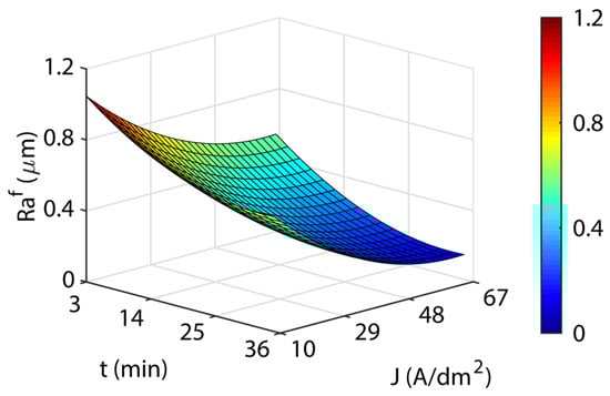 Figure 10 shows the response surface for specific electrical energy consumption Ce of the workpieces according to Equation (16). The blue areas represent a low cost, the green-yellow medium cost, and the yellow-red areas are a high cost. A substantial interaction was found between current density and EP time, which was quite similar to that obtained for the Δh variable. At low current density values (10 A/dm2), the effects of EP time on the cost Ce were negligible, with values of 0.002 and 0.019 kWh/dm2 for combinations of 3 min-10 A/dm2 and 36 min-10 A/dm2, respectively. However, at high current density values of (67 A/dm2), the EP time effect produced a large variation in the cost Ce with values of 0.031 and 0.373 kWh/dm2 for the combinations 3 min-67 A/dm2 and 36 min-67 A/dm2, respectively. Similarly, for the EP time parameter, the influence on the cost varied according to the (low or high) current density value. The maximum value of the cost Ce was 0.373 kWh/dm2 for 67 A/dm2 and 36 min. Though both parameters exhibited quasi-lineal behavior, the slope increased from the medium values of J and t.
