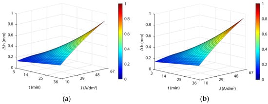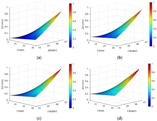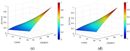 Figure 7 shows the response surface obtained for this model (Equation (6)). The blue areas represent high dimensional accuracy, green-yellow medium dimensional accuracy, and yellow-red areas have low dimensional accuracy. As shown in Figure 7, the response surfaces obtained with model Equation (6) for the four temperatures analyzed revealed a substantial interaction between current density and EP time. The influence of the current density parameter on dimensional accuracy depended on the value (low or high) of the EP time and vice versa. At low current density values, EP time produced negligible effects on the ∆h variable, but at high current density values, the effect of EP time produced large variations in the variable ∆h (Figure 7). Similarly, for low EP time values, the current density also had a minor effect on the Δh variable, but at high EP time values, the effect of current density produced large variations in the variable ∆h (Figure 7). The maximum ∆h was obtained for maximum values of current density and EP time. The minimum ∆h was achieved with a current density of 32 A/dm2 and a minimum 3-min EP time for all analyzed temperatures (Table 11). This was due to the 3-min current density curve reaching a minimum at 32 A/dm2 (Table 11). The maximum Δh was obtained with maximum current density (67 A/dm2) and EP time (36 min), with a quasi-lineal behavior of both EP parameters in relation to the variable Δh. As shown in Figure 7, and Table 11, dimensional variation was found to vary significantly, ranging from a minimum thickness variation of 0.031 mm to a maximum of 1.036 mm, depending on the electropolishing conditions, which underscored the significant changes in the dimensional accuracy of a product when the EP process was not optimized. As for temperature, the lowest dimensional variation was obtained at a temperature of 35 °C in all of the current density and EP time combinations. This temperature also exhibited excellent behavior in process performance ∆Ra and surface roughness Moreover, this temperature involved the lowest cost in terms of heating the electrolyte.
