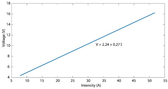 Voltage-intensity relationship in the electropolishing cell used in the experimental tests.