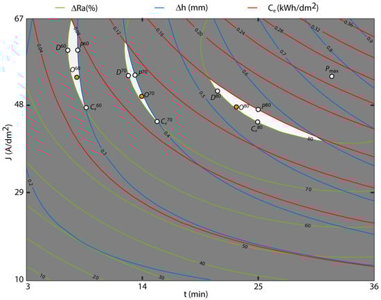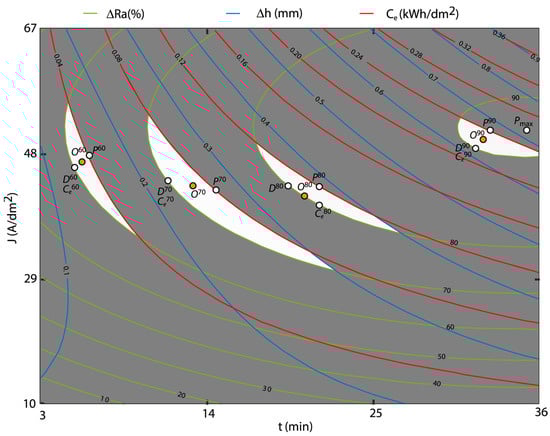 The contour graphs were obtained using the multivariable polynomial regression models for the response variables ΔRa, Δh, and Ce from the previous sections (Equations (2), (3), (6), (7), and (16)). The polishing ranges ΔRa were established at 10% intervals, and from a productive perspective, only polishing ranges above 60% were analyzed. For the variable Δh, contour lines were established every 0.1 mm, and for the variable Ce, every 0.04 kWh/dm2. Taking into account these aspects, Figure 11 and Figure 12 show the OCP method for the three variables under analysis. For each polishing range, the maximum polishing point Pi, minimum dimensional variation Dj, and minimum cost Ci were determined, where i was the polishing rate. Finally, the optimum multi-objective point Oi was graphically determined by minimizing the maximum distance between these three optimum points.