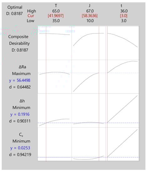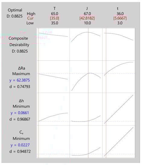 In relation to individual desirability (Figure 14), the temperature was found to be the parameter having the smallest effect on the individual desirability of the response variables, with no effect on cost Ce and a slight impact on the polishing rate and dimensional variation. The minimum temperature analyzed (35 °C) obtained the maximum polishing rate and the minimum dimensional variation. The greatest impact of current density was on the desirability of the ΔRa response, with an optimum multi-objective of 42.82 A/dm2, very close to the maximum of ~48 A/dm2 obtained in the individual analysis. However, the effect of current density on the desirability of Δh and Ce was small, given that an increase in the value of this parameter produced a small increase in either desirability. EP time was the parameter having the greatest impact on the desirability of the Δh and Ce responses, with an increase in either significantly worsening the desirability of both responses. Thus, the optimum multi-objective was achieved with low EP time values of 5.66 min, which minimized dimensional variation and cost. These results confirmed those obtained in the individual analysis of the response variables in the above sections. The lowest desirability was obtained for the ΔRa response with a value of ~0.75. This response improved significantly with increased J or t, but both parameters combined, mainly t, worsened the desirability of Δh and Ce. The individual desirability of the Δh and Ce responses were ~0.97 and ~0.95, respectively, very close to the maximum desirability.
