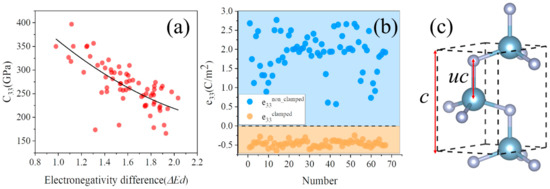 As shown in Figure 2, we explored in detail the mechanism of co-doping to enhance the characteristics of the C33 and e33, respectively. The hardness of the crystal is positively related to the bond density and negatively related to the ionicity indicator fi [42,43,44]. Figure 2a is the relationship of the C33 and the electronegativity difference ΔEd,