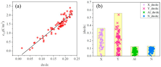 Figure 3. (a)The relationship of the e33 and du/dε. du/dε is measured by calculating the response of the u(n) under a macroscopic strain (η = 0.5%). The result of the linear fitting is shown as a solid line. (b)The |du/dε| of X, Y, Al, and N in X0.125Y0.125Al0.75N alloys.