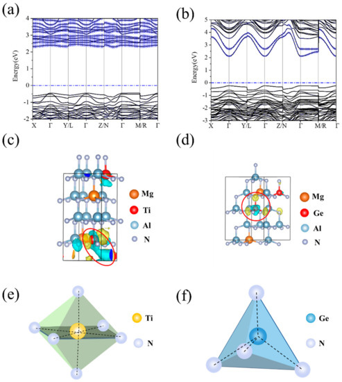 Figure 4. (a,b) Band structures of Mg0.125Ti0.125Al0.75N and Mg0.125Ge0.125Al0.75N. The blue error bar respectively represents the contribution of the d-electrons of Ti and s-electrons of Ge. (c,d) Wave function analyses of Mg0.125Ti0.125Al0.75N and Mg0.125Ge0.125Al0.75N are shown in red circles. Blue represents bonding orbitals, and yellow represents anti-bonding orbitals. (e,f) The structure of Ti3N4 (Octahedral coordinates) and Ge3N4 (Tetrahedral coordinates).