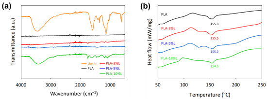 The differential scanning calorimetry transitions depicted in Figure 2b indicate that the glass transition temperature, Tg and melting temperature, Tm for PLA were recorded at 54 and 155 °C, respectively. The previous work based on organosolv extraction lignin from OPEFB fibers exhibited a thermoplastic characteristic with a glass transition temperature, Tg around 97 °C [24]; thus, there was a slight increment in the glass transition value from 120 to 130 °C with the increment in lignin in the filament composites. The glass transition temperature was still at 50 to 60 °C.