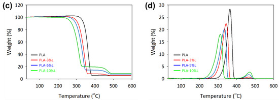 The thermal decomposition of filament composites was clearly disrupted by the addition of lignin as a filler (see Figure 2c,d). The PLA–lignin composites exhibit a two-step degradation process. The first step is due to the thermal degradation of the PLA polymer chain, which is associated with active pyrolysis and oxidation, and occurs within a temperature range of 150 to 400 °C [26]. The second step is associated with the lignin decomposition, which produces volatile gases and a relatively high char carbon residue, and occurs slowly at temperatures above 450 °C [24]. The presence of the char carbon residue in the filament composites results in a higher level of decomposition, which increases with the higher lignin content, reaching up to 18.54% at 600 °C, as shown in Table 1. The higher residual weight of 39.71% at 600 °C is due to the breaking of the bonds of the lignin molecules, which subsequently release phenols in vapor phases [24]. In contrast, only one degradation step was observed for the neat PLA, consistent with previous reports [18,27]. Although, theoretically, PLA polymers and filament composites have a higher glass transition temperature than organosolv lignin, nevertheless their glass transition temperatures are nearly equivalent.