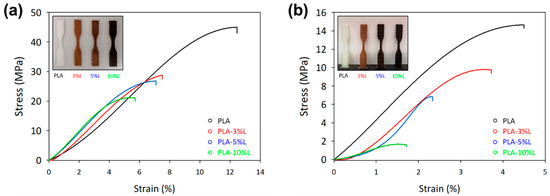 The increment in Young’s modulus is comparable from the previous findings associated with the improvement in the interlayer adhesion of 3D printing [13,19,24,35]. Additionally, the mechanical analysis of 3D printed objects with lignin showed a higher tensile strength and modulus compared to those printed with neat PLA (please refer to Table 2). The inclusion of lignin improved the interlayer adhesion, resulting in a 57% and 31% increase in the Young’s modulus of PLA-3% and PLA-10%, respectively. Although a higher lignin content was found to have a lower impact, the printing process nevertheless managed to improve tensile and modulus properties by 82% with the PLA-10%L blend.