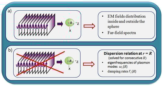 Illustration of the differences between the schemes used and the obtained data from (a) Mie scattering formalism (incoming field from external sources present) and (b) the self-consistent approach with no EM field present, which allows finding the dispersion relation at the spherical metal–dielectric interface.