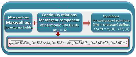 The dispersion relation (Equation (1)) results from the continuity relations at the sphere boundary imposed on the solutions of the self-consistent, divergent-free Maxwell equations in the absence of the incoming light field [47] (recollected in [48]), according to the scheme presented in Figure 2. The solutions exist only for the complex, discrete eigenvalues (In our previous papers (see e.g., [15] and references therein) we have used for denoting the imaginary part of the complex eigenvalues. Such a choice has been motivated by connecting to the Lorentzian profile of LSP resonances manifesting in the spectra in the case of small damping () for the normalized profile such that the central intensity of the mode l . In such a case, the Lorentzian profile with denoting the full width at half maximum (FWHM) of the profile [50]). Calculated for successive radii R, it allows us to find the radius-dependent oscillation dynamics of the mode l of the surface localized harmonic EM field allowed at the interface: