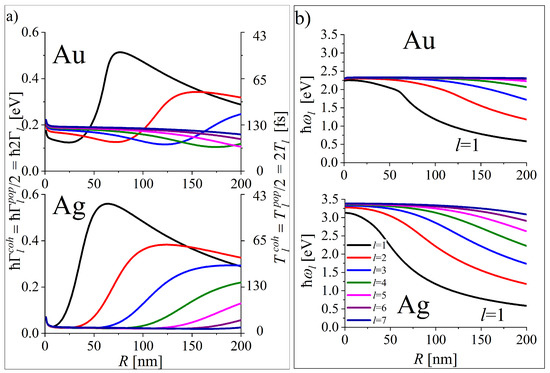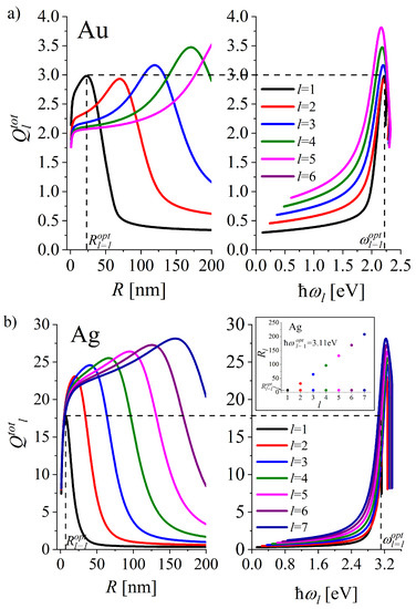 Let us notice, that the EM waves of frequency (black, dashed lines in Figure 7) is not only quite effective in resonant excitation of higher multipolarity LSPs of the same radius as , but also for larger radii (Figure 7), since NPs excited at such frequency possess relatively large quality factors . LSP excitation with the light wave of frequency is expected to excite not only the dipole plasmon but also the higher multipolar plasmons. For the increasing size, diminishes. However, all the plasmon modes with are excitable for a given R until the decrease in for the consecutive l. From a practical point of view, this effect is especially interesting in the case of Ag NPs, as relatively smaller Ag NPs form the effective plasmonic cavity at . The inset in Figure 7b shows the radii of Ag nanoplasmonic cavity with as high as that of . The corresponding quality factors are considerably higher than those for Au NPs.