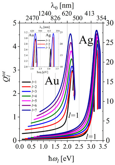 Figure 7b shows the dependence of the quality factors on the resonance frequencies of multipolar plasmon modes. The LSP resonance frequencies corresponding to the maxima of the quality factors with different l (and those of ) are grouped in two spectral ranges: in the green in the case of gold and in the violet for silver NPs (see Figure 8) (see also Table 1).