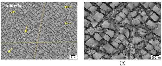 Figure 8 shows SEM images of the surface microstructure before and after LSP. γ matrix channels surrounded the γ′ precipitates. The SEM images revealed a specimen surface with deformed areas that did not melt following LSP (Figure 8b–f). Even though an Al foil coating was covering the specimen, thermal damage was observed as a result of the interaction between the laser and the surface (Figure 9). As the surface was heated above its melting point, molten γ′ flow at the top reached about 20 nm in depth with increasing surface roughness. The melting point of the IN738LC alloy was 1325 °C [33], which was much lower than the temperature of the plasma formed near the surface [34,35,36,37,38]. Considering the microhardness, which is related to its strength, and the appearance of the thermal damage on the surface, 10 GW/cm2 and 1T were regarded as the optimum processing conditions.