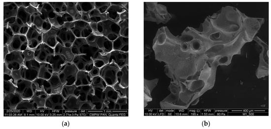 As an epoxy matrix, the Epidian 6 epoxy resin (diglycidyl ether of bisphenol A, CIECH-Sarzyna, Poland) with amine curing agent (TETA, triethylenetetramine, CIECH-Sarzyna, Poland) was used. Open-porous glassy carbon foams (Cof) obtained as a result of pyrolysis of polyurethane foams were the reinforcing components as open-celled foams with porosity 20, 40 and 60 ppi (Figure 1a). Subsequently, these polyurethane foams were coated with phenol-formaldehyde resin (FF110), which was subsequently cured under typical conditions for resin. Finally, the foams obtained were pyrolyzed under the standard conditions described elsewhere [33]. Epoxy composites with carbon open-celled foam reinforcement were fabricated using the infiltration method.
