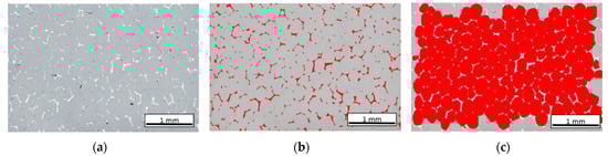 The microstructure of polished composites was determined by light microscopy (Olympus GX-71) using the bright field technique. For quantitative stereological examination, 50 LM images were recorded giving a total area of 15 mm2. The ImageJ software was applied to the measurements, with the procedure presented in Figure 2.