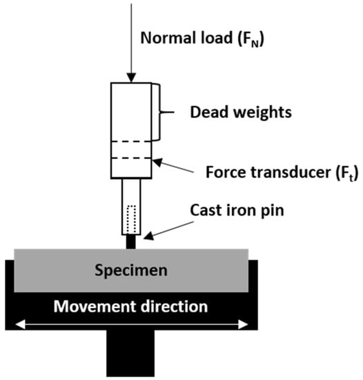 The tribological characteristics were carried out under technically dry friction conditions using the pin-on-block method (reciprocating movement) using the TM-01M tribotester (Figure 3).
